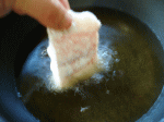180度の油で揚げてください。片栗粉を油の上に落としてすぐに浮かんだら適温。