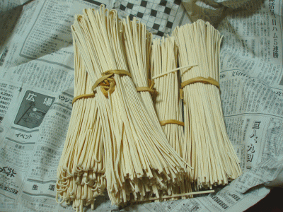 那須高原のうどんで押さえておきたいポイントは「島田うどん」のこと。イメージとしては秋田県の「稲庭うどん」に近いですが、これは栃木県北部の特産品です。細いうどんを干している様子が昔の花嫁の髪形「高島田」の形に似ていることからそう呼ばれています。普通のうどんよりも手間がかかるのでちっょとした高級うどんといった感じで、うちのお中元も毎年島田うどんが贈られたりするわけです。那珂川町馬頭では、物々交換だった時代に小麦1斗で島田うどん12束と交換したそうです。