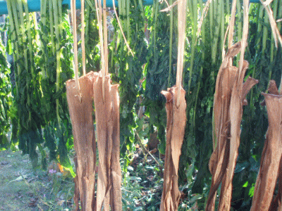 コザでしんなりさせると皮が剥きやすい。ヒモを通して干す |