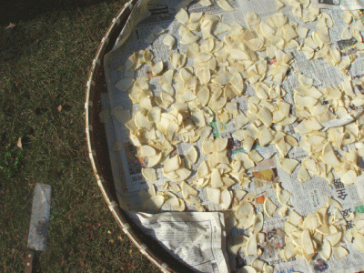 干し方のスタンダードは、薄く切って干すだけなんですが、新聞紙やザルなんかを用意して水気を取ることがポイント。風通しのよい軒下なんかで陰干ししますが、あまり気温が高いと腐ってしまうのでなかなか難しいです。