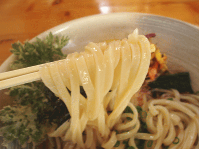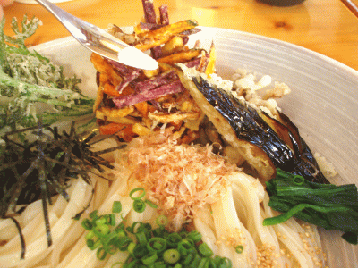 岡本」は、すべてにおいて高水準にあり、那須高原の風景の中に溶け込んでいる素晴らしいお店です。そういうお店は決まって観光客がワイワイしてそうですが、客層は別荘地帯にあるということもありほとんどが地元の人。つまり、那須高原を食べ歩きに歩いて、「やっぱ、うどんだわ」と思い至った人は、最後に岡本のどんぶりの縁に口をつけてホッとするのです。おすすめは「野菜天ぶっかけうどん」(850円)で写真はその大盛。食べるにはちょっとした作法があって、まず、舞茸や根菜類のかき揚げにレモンを絞って塩でいただく。うどんに汁をかけたら、全部を混ぜないで、鰹節、海苔、おろしと、それぞれの薬味をからめながら食べる。どうです、食べたくなってきた?
