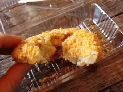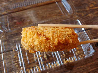 那須高原友愛の森「ふれあいの郷直売所」のミニレストランで売っている「おからコロッケ」1個80円です。じゃがいもだとポテトサラダを食べているような水っぽい食感ですが、おからは歯ごたえがあって、サクサクとした衣とおからの甘味が絶妙です。ソースはどっぷりとかけましょう。