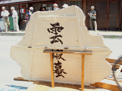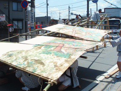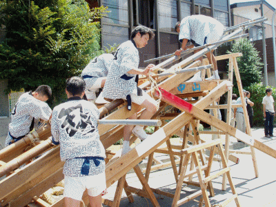 手早く骨組みを作る。これはもう名人芸です 地車の移動は大変。作業を見守るのも祭りの醍醐味