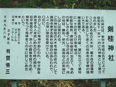 空気がひんやりとしたパワースポット 左が樹齢370年の「桂の木」、右が「とちの木」