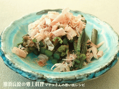 | 水切りしたらお好みの大きさに切って、鰹節と醤油で味付け。 |