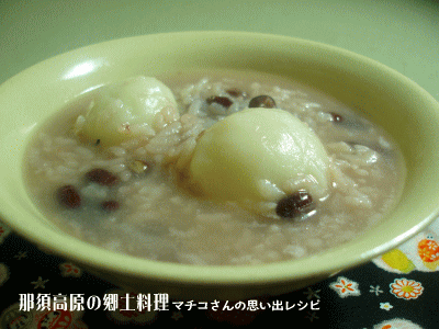 白河市の郷土料理に「あつかゆだんご」というレシピがあります。これは、正月14日の「だんごさし」で使っただんごを少し残しておいて、15日に赤飯を炊き、その残りと混ぜて17日におかゆにして食べました。
