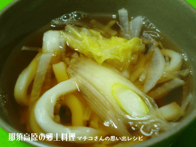 「野菜の煮込みうどん」は那須町のレシピを参考にしました。文献によると、野菜を具にして味噌味と醤油味の両方があります。うどんは冠婚葬祭や近所の集まりごとのたびによく作ったそうです。