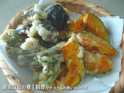天ぷらの揚げ方は、いろいろな方法がありますが、那須高原の天ぷらの特徴は、地物の小麦粉を使って“ぼってり”と揚げるということでしょうか……? もともと素材が新鮮なので、凝った作り方をしなくても、揚げたての天ぷらに醤油をジャーとかけて食べる。これがいいのです。食べたくなってきませんか?