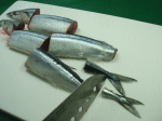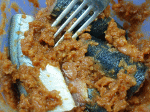 | 腹が開いたさんまの中に味噌を塗りつけます。 |