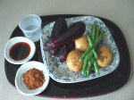 夏の食事には、根菜を使った煮物も食べましょう。じゃがいも、なす、どじょういんげんの煮しめは、8月16日の送り盆の昼に食べていました。夏野菜の煮しめといったところですね。