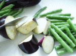 ●なすは一口大に、どじょういんげんは筋を取って3cmぐらい、じゃがいもは大きめに切る。