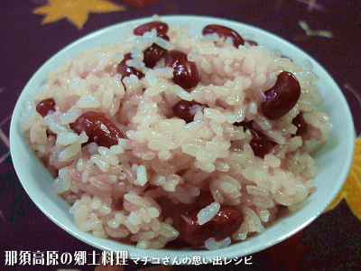赤飯はお祭りやお祝いの日に食べる定番の食事です。那須町では餅米に小豆を混ぜて蒸かすのを「おこわ」または「こわめし」と呼んでいて、うるち米に小豆を混ぜて炊くのが「あずきごはん」です。特別な日は「おこわ」を蒸かしましたが、「あずきごはん」は普段の日でも食べていました。白河のほうでは餅米に小豆を入れて炊いたものを「あげえめし」、うるち米を蒸かして小豆を入れて赤くしたのが「おこわ」だそうです。地域によって呼び方はさまざま。