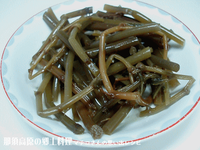 | 3センチほどに切り、水、醤油、削り節で煮込んでできあがり。 |