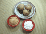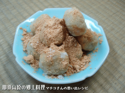 潰したじゃがいもを団子状にし、そこにきな粉をまぶしたらできあがり。