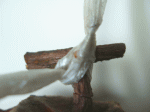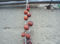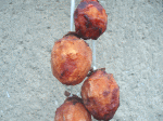 へたにナイロンテープを結びます。ヘタの枝がないものは、鉄串かザルの上でも干せます。