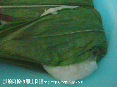 「さんきり餅」は別名を土用餅といいます。白河市では青じその葉をサンドしましたが、那須塩原市ではさんきらいの葉をはじめ、柿の葉やみょうがの葉で包みます。「土用餅を食うと腹わたになる」、つまり体力がつくと言われています。