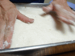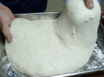 片栗粉を振った四角のトレーに餅を入れて、上から手の平で押し込みます。